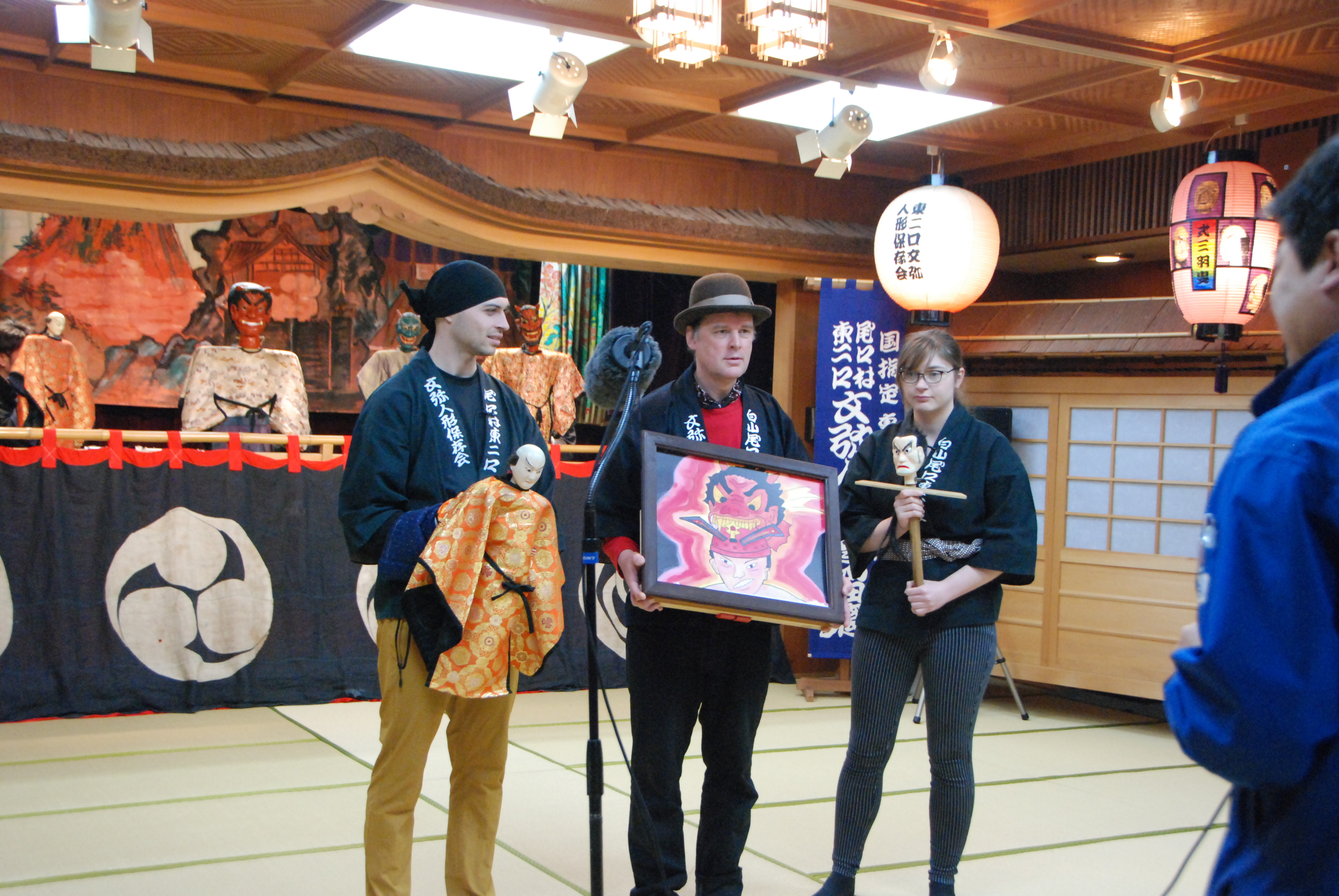 白山市国際交流室による企画「でくの舞絵本」の英語版紙芝居をYouTube配信するための活動がいよいよ始動しました。昨日(3/20)は、東二口文弥人形浄瑠璃保存会の協力のもと、動画の序章部を撮影。「でくの舞」について英語で解説をしてくれたのは、現在白山市役所に勤務するダニエルさん(英国)とスーザンさん(オーストラリア)。そして「酒呑童子」の物語を紹介してくれる金城大学短期大学部教授ガートさんとの絶妙な掛け合いで、撮影は和気藹々と進みました。